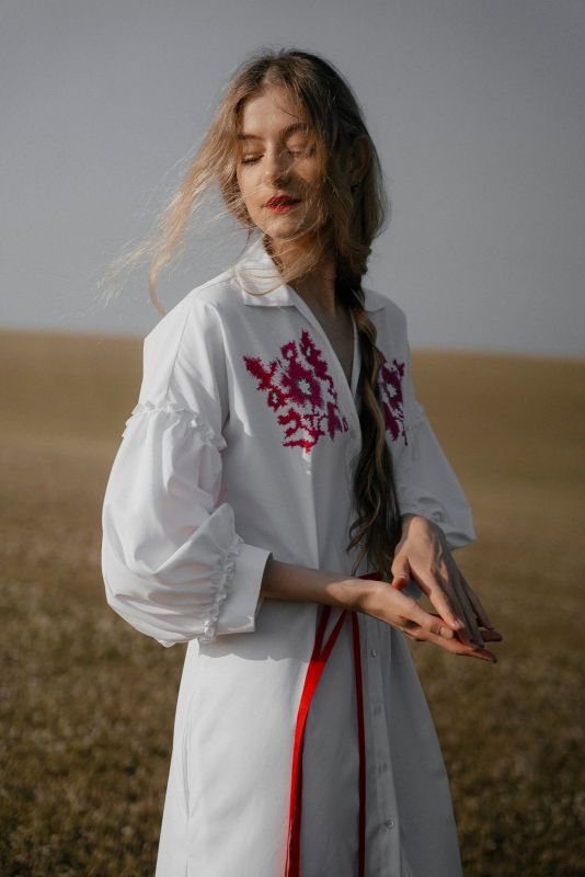 The blouse was created using Augmented Reality technology by FFFACEME studio for the Olena Dats' brand. By following the link on the blouse, you will also become the owner of a virtual 1920s vyshyvanka of Borshchiv region from the private collection of the designer's family.